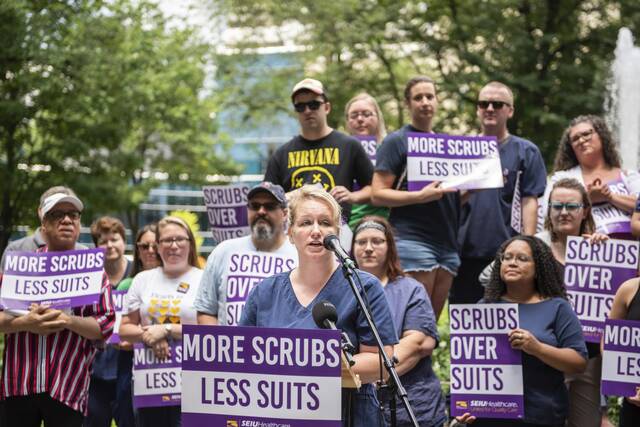 Citing an ongoing shortage of nurses and concerns for patient safety, the unionized registered nurses of Allegheny General Hospital urged health care workers throughout the region to demand improvements to staffing levels. At a news conference Wednesday at Allegheny Commons Park North in Pittsburgh, the RNs represented by SEIU Healthcare Pennsylvania spoke ahead of contract negotiations. The 1,200 unionized AGH nurses are working under a contract negotiated in 2020. It expires Oct. 13.,2023 Meetings are expected to be held in the coming weeks. Over the next year, 4,200 union members at six hospitals that are part of the Allegheny Health Network, UPMC and Heritage Valley will be negotiating new contracts. AGH and Allegheny Valley Hospital in Harrison are part of the Allegheny Health Network. “In 2020, we negotiated a tremendous contract, and yet the past three years have been the most challenging of our careers,” said Katrina Rectenwald, union chapter president. She is an ICU nurse at AGH. “We’ve watched one experienced nurse after another leave. We’ve been short-staffed. We’ve picked up extra shifts and more shifts on top of that. We’ve trained traveling nurses to do our job for three times the pay. We’ve been assaulted and verbally abused by patients and visitors.”