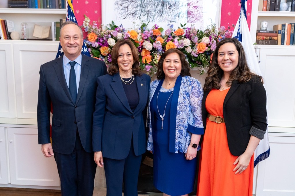 Vice President Kamala Harris and husband Doug Emhoff with Rosamaria Cristello and her mother at the vice president’s house honoring Mother’s Day. (Photo courtesy of the Latino Community Center)