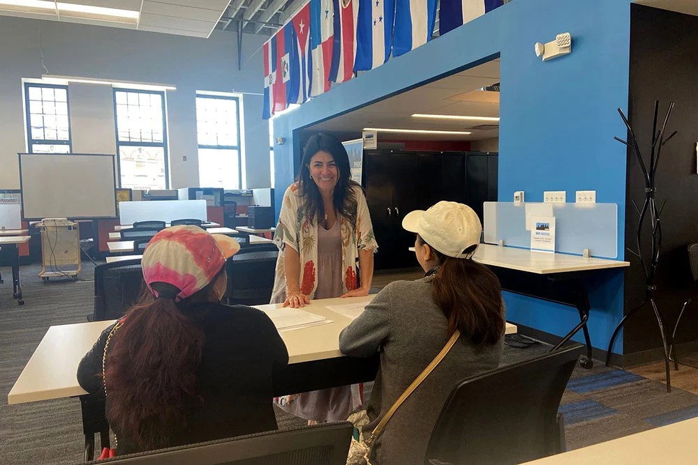 Lorena Ficarra, housing navigator for the Pittsburgh Hispanic Development Corp. in Beechview, talks with clients. (Photo courtesy of Pittsburgh Hispanic Development Corp.)