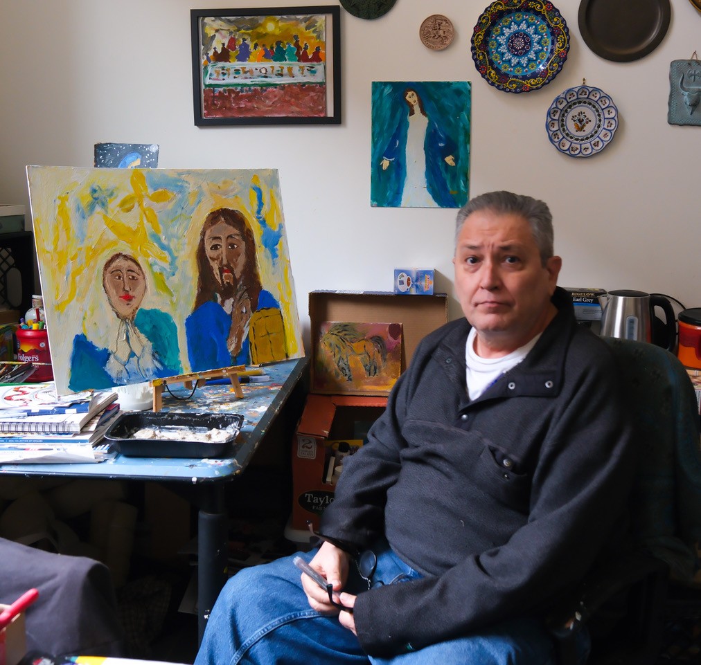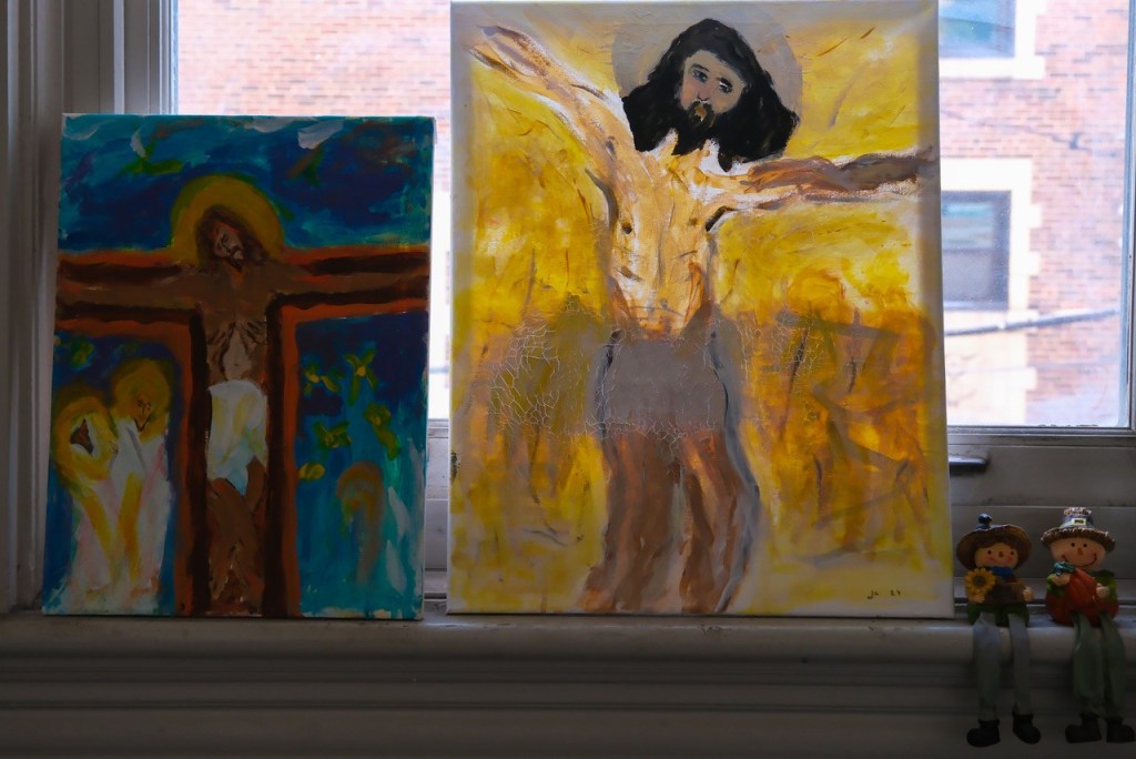 Israel Centeno’s faith-themed art is displayed throughout his apartment. (Photo by Tracy Certo)