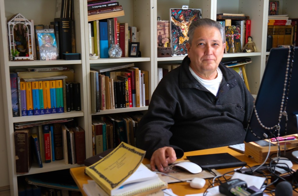 Israel Centeno in his office displaying his novel, “The Conspiracy.” He was targeted by militia forces and persecuted for years following the book’s publication. (Photo by Tracy Certo)