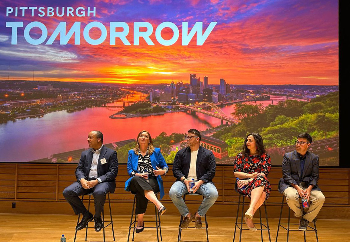 A panel of civic and business leaders spoke at the June 2025 Pittsburgh Tomorrow event. (Photo by Alice Crow/Technical.ly)