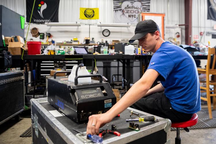 Josh Quigley, Pyrotecnico electrical maintenance technician, works on a fog generator at the company’s Union Township headquarters. (Tanner Mondok/New Castle News)